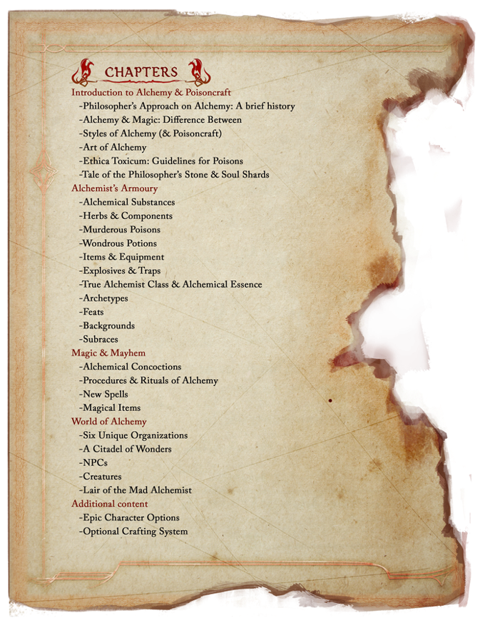 Alchemy & Poisoncraft is a source book for Dungeons & Dragons 5th edition. Offering a variety of content, for every aspect of the game with an alchemical influence and a touch of creative yet deadly poisons. The aspects vary from character options for players to dungeon master and world-building tools. They will introduce wondrous alchemy to your unique worlds. Aside from a collection of monsters, alchemical items, and components, it offers a philosophical and ethical approach to alchemy to aid story building.