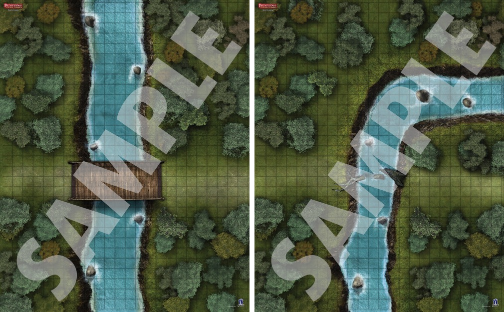 Down to the River! The river represents freedom of travel—and danger! Depicting a treacherous river bend and surrounding woods, Flip-Mat Classics: River Crossing makes a great set piece for escaping pursuers, holding a bridge, or battling an aquatic beast!
